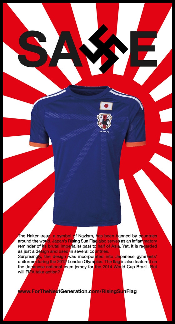 또한 광고 문구에는 '2012년 런던 올림픽 일본 체조 국가대표 선수들 유니폼에서도 전범기 문양이 사용됐다. 심지어 이번 브라질 월드컵 일본 축구 대표팀 유니폼에서도 사용 될 예정인데 FIFA는 가만히 있을 것인가?'라며 강하게 비판했다.