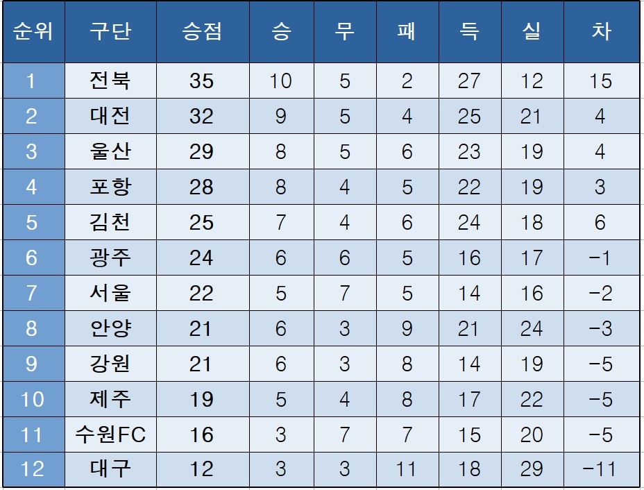 [K리그] 중간 순위(1일)안영준 기자2025.06.01 오후 09:06 Copyright ⓒ 뉴스1. All rights reserved. 무단 전재 및 재배포, AI학습 이용금지.