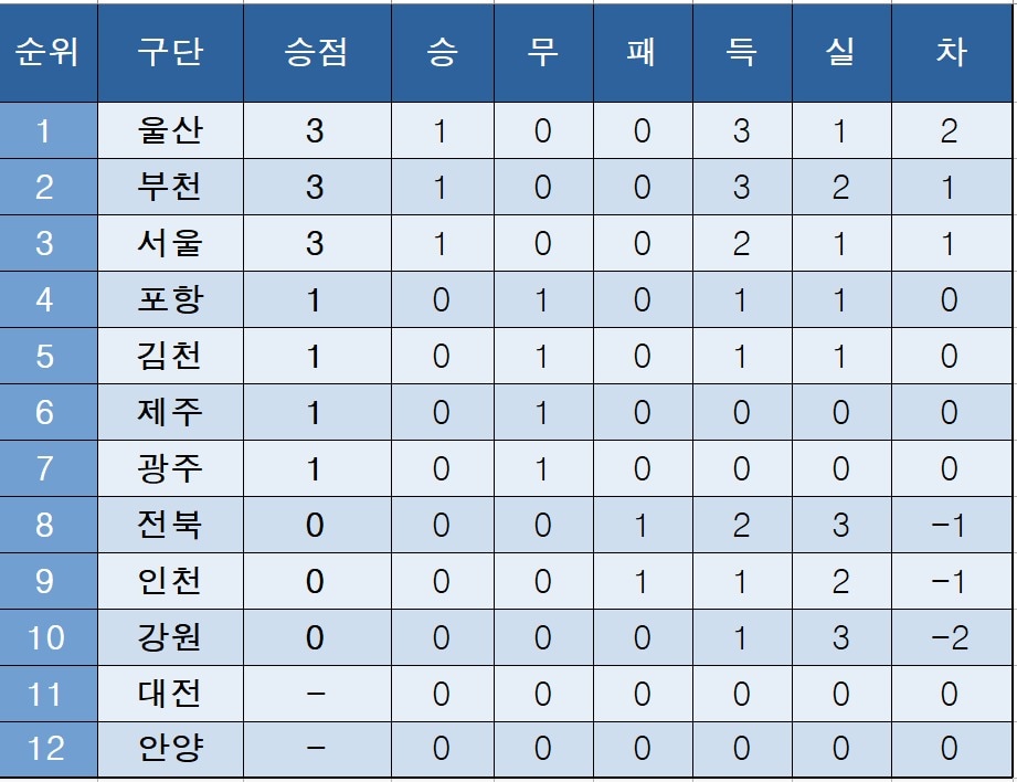 [K리그1] 중간 순위(1일)안영준 기자2026.03.01 오후 06:34 Copyright ⓒ 뉴스1. All rights reserved. 무단 전재 및 재배포, AI학습 이용금지.