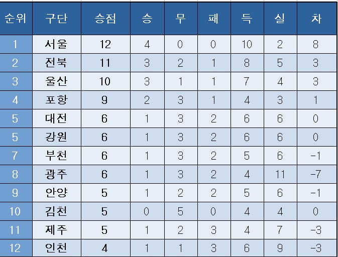[K리그1] 중간 순위(4일)안영준 기자2026.04.04 오후 06:43 Copyright ⓒ 뉴스1. All rights reserved. 무단 전재 및 재배포, AI학습 이용금지.