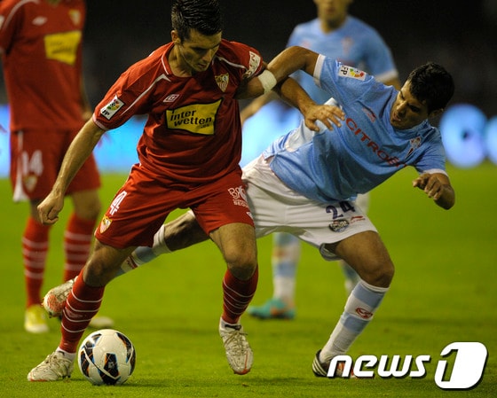 비고의 발라이도스 경기장에서 세비야의 에미르 스파히치 선수와 셀타비고의 아우구스토 페르난데즈(Augusto Fernandez) 선수의 모습. 2012. 10. 5. AFP / MIGUEL RIOPA / News1, 무단전재 및 재배포금지