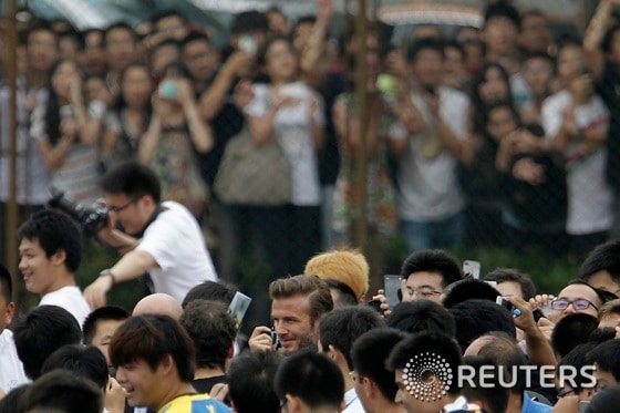 전 잉글랜드 축구 스타 데이비드 베컴(가운데)이 20일 중국 상하이 퉁이대학에 도착하자 많은 팬들이 몰려들고 있다. 베컴은 중국어린이들이 축구에 대한 관심을 갖기를 바란다고 말하면서 중국 축구의 보잘것없는 역사는 더이상 논의할 필요가 없다고 말했다. © 로이터=News1