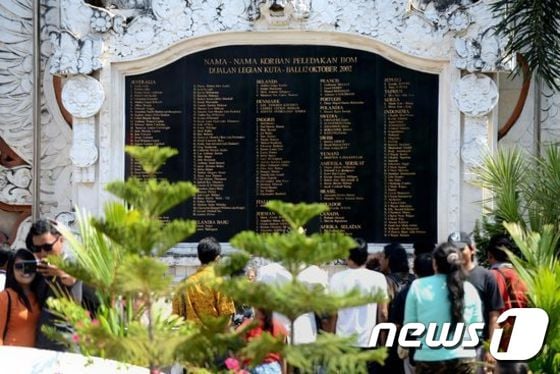(발리 AFP=뉴스1) 최종일 기자 = 인도네시아 발리에서 연쇄 폭탄테러 13주기를 맞은 12일 관광객들이 사망자들의 이름이 적혀 있는 추모비를 쳐다보고 있다.