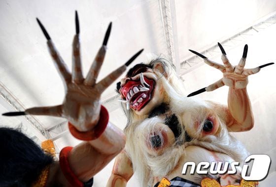 (발리 AFP=뉴스1) 최종일 기자 = 인도네시아 발리의 아이들이 7일 대나무와 종이 등으로 만든 악귀 오고오고(Ogoh Ogoh)를 보고 있다. 발리에서는 힌두력의 새해인 녀삐(Nyepi) 전날에 오고오고 퍼레이드(가두행진)를 연다. 이후 인형을 모닥불에 태운다.