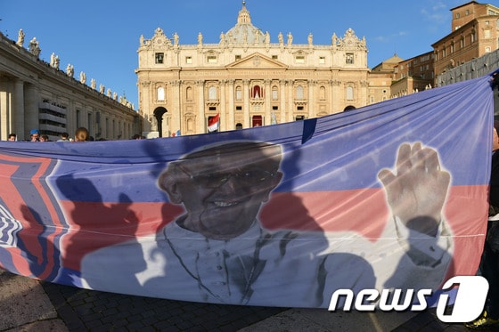 가톨릭 신자들이 교황 프란치스코의 얼굴이 그려진 현수막을 교황 취임식이 치러지는 19일(현지시간) 바티칸 성베드로 광장에서 들고 있다. ©AFP=News1