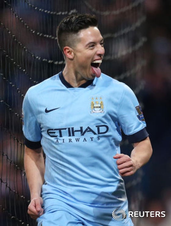 (맨체스터 로이터=뉴스1) 이기창 기자 = 잉글랜드 프리미어리그 맨체스터 시티의 프랑스 출신 미드필더 사미르 나스리가 23일(현지시간) 맨체스터 에티하드구장에서 뉴캐슬 유나이티드를 상대로 열린 경기서 팀의 2번째 골을 성공시킨 뒤 혀를 쏙 내밀며 익살스러운 표정을 짓고 있다. 맨시티가 5-0으로 대승했다.