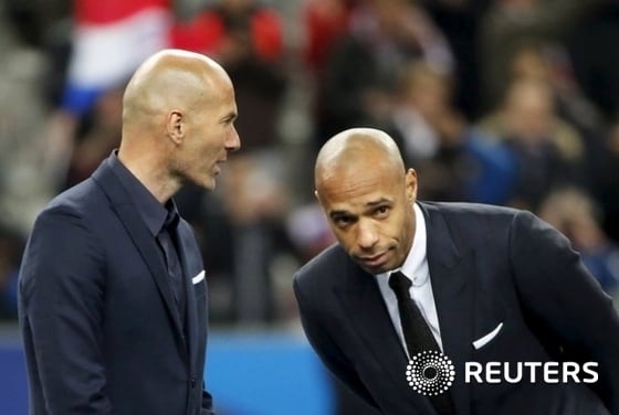 (파리 로이터=뉴스1) 이기창 기자 = 프랑스축구대표팀 주장과 스트라이커로 한 시대를 풍미했던 지네딘 지단(왼쪽)과 티에리 앙리가 26일(현지시간) 파리 인근 생드니구장에서 열린 프랑스 대 브라질의 A매치 시작을 기다리며 담소를 나누고 있다.