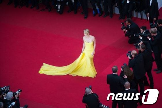 (칸 AFP=뉴스1) 이기창 기자 = 남아공 태생의 미국여배우 샤를리즈 테론이 14일(현지시간) 프랑스 칸에서 열리고 있는 제68회 칸영화제 출품작 '매드 맥스:퓨어리 로드(Mad Max : Fury Road)' 시사회에 화사한 노랑색 드레스를 입고 참석, 시선을 모으고 있다.