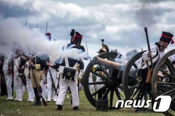 (샬롱 AFP=뉴스1) 이기창 기자 = 나폴레옹 시대의 군대도 변신한 프랑스인들이 워털루 전투 200주년을 앞두고 31일(현지시간) 샬롱 쉬르 손에서 당시 프랑스군 대 영국-프로이센 연합군의 전투상황을 재연하고 있다.
