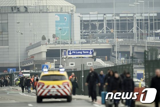 (브뤼셀 AFP=뉴스1) 최종일 기자 = 22일(현지시간) 오전 벨기에의 브뤼셀 국제공항에서 2차례 폭발이 발생해 10여명이 사망하고 30여명이 부상한 가운데 공항에 있던 사람들이 대피하고 있다. 뒤로는 폭발로 인해 거의 모든 창문이 깨진 공항 출국장의 모습이 보인다.