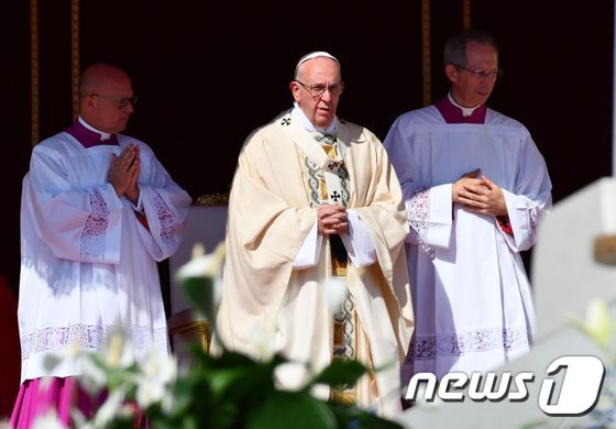 (바티칸 AFP=뉴스1) 최종일 기자 = 가난한 이들을 위해 희생하는 삶을 산 '빈자의 성녀' 고(故) 테레사 수녀(1910~1997)가 4일(현지시간) 성녀(聖女·saintess)로 공표됐다. 프란치스코 교황은 이날 바티칸 성베드로 대성당 광장에서 "성삼위 일체의 영예에 따라 우리는 신성한 콜카타의 테레사를 성인으로 공표하며 그를 성인 명부에 올린다"고 밝혔다. 사진은 테레사 수녀의 시성식과 시성미사 주례하는 교황의 모습(가운데)이다.