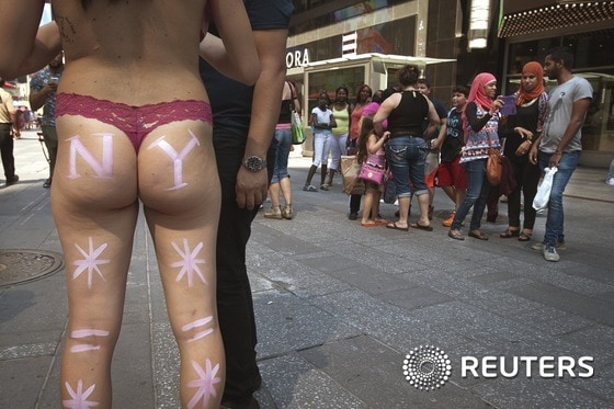 (뉴욕 로이터=뉴스1) 우동명 기자 = 18일(현지시간) 미국 뉴욕 타임스 스퀘어에서 반라에 팬티만 착용한 채 성조기 문양 등의 보디페인팅을 한 여성들이 논란이 되고 있다. 빌 더블라지오 시장등 뉴욕 공무원들은 관광객들과 기념사진을 찍은 뒤 팁을 받는 '토플리스 여성'에 대한 조치를 고려중 인것으로 알려졌다.