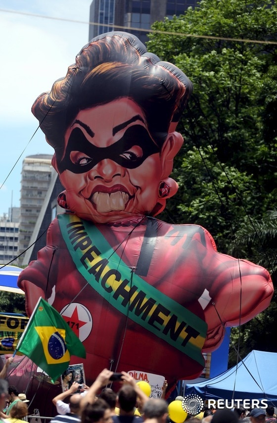 (상파울루 로이터=뉴스1) 우동명 기자 = 13일(현지시간) 브라질 상파울루에서 지우마 호세프 대통령의 탄핵을 촉구하는 반정부 시위대가 악당의 모습을 한 풍선인형을 들고 거리로 나섰다.