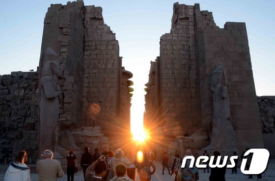 (룩소르 AFP=뉴스1) 우동명 기자 = 22일 (현지시간) 이집트 룩소르의 동지 해가 카르나크 신전 뒤로 떠오르고 있다. 카르나크 신전은 이집트의 가장 위대한 신으로 유명한 아몬 신에게 바쳐진 것으로 알려졌다.