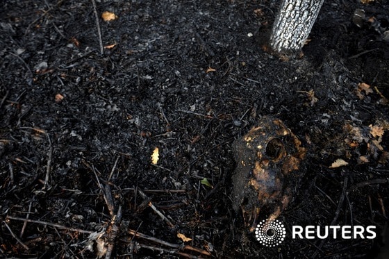 (오비에도 로이터=뉴스1) 우동명 기자 = 29일 (현지시간) 스페인 북부 오비에도 인근의 숲불이 지나간 자리에 죽은 동물의 유해가 보인다.