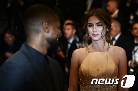 (칸 AFP=뉴스1) 우동명 기자 = 가수 어셔 레이먼드 4세가 16일 (현지시간) 제69회 칸 국제 영화제에서 영화 ‘핸즈 오브 스톤’ 상영식에 도착하여 배우 아나 디 아르마스 와 얘기를 나누고 있다.