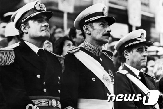 (부에노스아이레스 AFP=뉴스1) 우동명 기자 = 1977년 1월 3일 부에노스아이레스에서 호르헤 라파엘 비델라 대통령이 공식 기념식에 참가하는 모습. 남미 6개국 독재자들이 야당을 탄압,살해하는데 협력하기로 한 일명 ‘콘도르 작전’은 40여년만인 27일 (현지시간) 법정에 서게 된다.