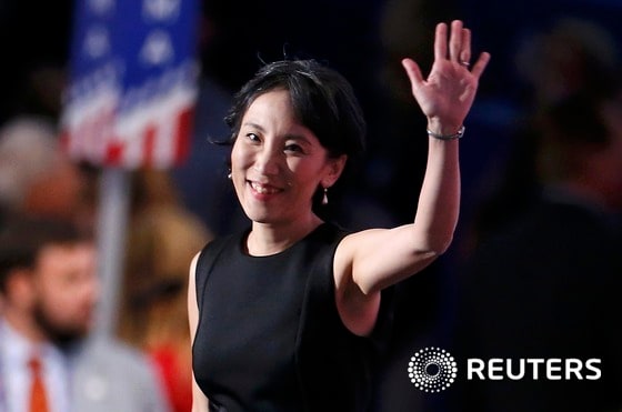 (클리블랜드 로이터=뉴스1) 우동명 기자 = 한국계 미국인 리사 신 박사가 21일(현지시간) 오하이오주 클리블랜드 퀴큰론스 아레나에서 열린 공화당 전당대회 마지막날 행사에서 도널드 트럼프 공화당 대선후보를 지지 연설을 하며 손을 흔들고 있다.