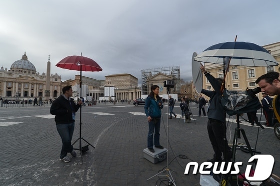 바티칸 성 베드로 성당 앞에 모인 저널리스트들. 세계 곳곳에서 이 곳 바티칸에 모인 추기경들은 새로운 교황을 뽑는 콘클라베(conclave, 잠긴 문이라는 뜻의 새로운 교황선출절차투표)를 12일부터 시작한다. AFP / VINCENZO PINTO / News1, 무단전재 및 재배포금지