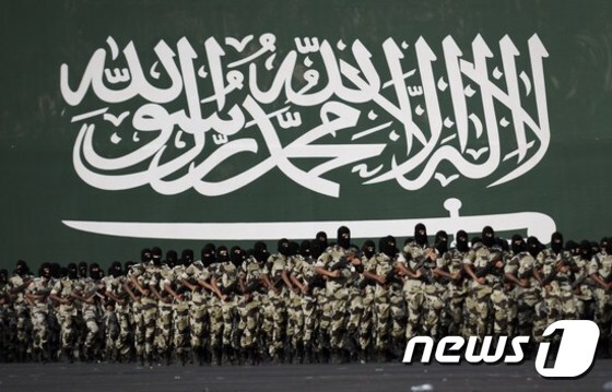 (메카 AFP=뉴스1) 이기창 기자 = 사우디아라비아 특수경찰대원들이 28일(현지시간) 하지순례를 맞아 메카에서 퍼레이드를 벌이고 있다. 이날 전세계 이슬람신자들은 연례 하지 순례기간를 맞아 100만명 이상이 성지 메카에 도착했다. 하지순례는 지구상에서 가장 많은 사람이 모이는 행사의 하나이다.