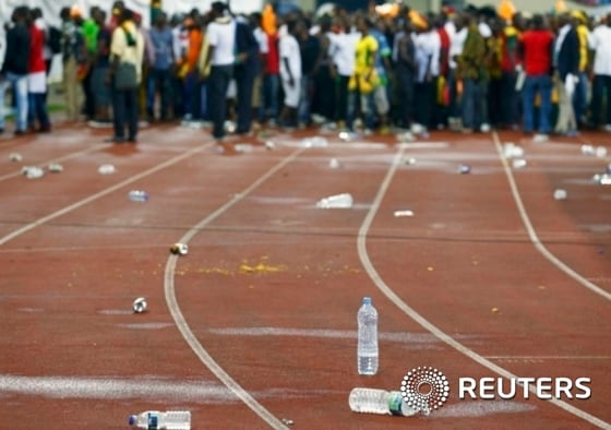 (말라보 로이터=뉴스1) 이기창 기자 = 2015 아프리카 네이션스 컵 개최국인 적도기니 축구팬들이 5일(현지시간) 말라보에서 열린 가나와의 준결승에서 자국팀이 0-3으로 완패하자 그라운드에 음료수병을 집어던지는 등 폭동에 가까운 소란을 피우고 있다. 관중의 폭력사태로 후반 종반 34분 동안이나 경기가 일시 중단되는 불상사가 발생했다.