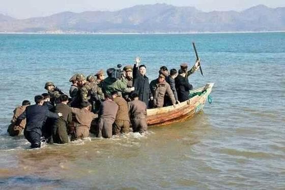 공개된 사진에는 김정은 국방위원회 제1위원장이 군 고위 관계자들로 보이는 이들과 해안에서 조그마한 목선을 타고 손을 흔드는 모습이 담겨 있다.