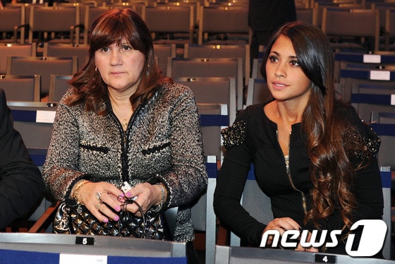 아르헨티나의 축구 스타 라이오넬 메시의 어머니인 셀리아 마리아 쿠치티니 메시(중앙)과 여자친구 안토넬라 로쿠조(오른쪽)이 스위스 쮜리히에서 열린 FIFA ballon d'or ceremony 에 참석중이다. 2012.1.9. AFP / FRANCK FIFE / News1,무단전재 및 재배포금지