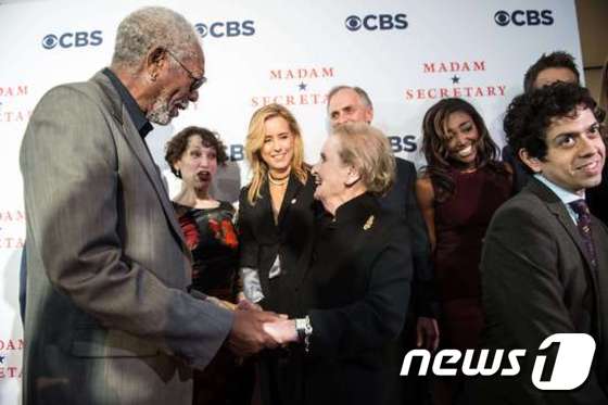 (워싱턴 AFP=뉴스1) 이기창 기자 = 미국 최초의 여성국무장관을 역임한 매들린 올브라이트 전 국무장관이 18일(현지시간) 워싱턴에서 열린 CBS의 새 시리즈 '마담 세크리터리(Madam Secretary)' 홍보행사에 참석, 제작책임자이자 명배우인 모건 프리먼과 악수를 나누고 있다. 새 시리즈는 여성장관을 소재로 하고 있다.