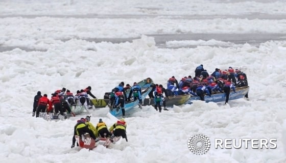 (퀘벡시티 로이터=뉴스1) 이기창 기자 = 캐나다 퀘벡주의 겨울축제 동안 열리는 아이스 카누에 출전한 선수들이 8일(현지시간) 꽁꽁 얼어붙은 세인트 로렌스강 위에서 카누를 밀고 끌며 치열한 경쟁을 벌이고 있다.