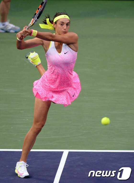 (인디언웰스 AFP=뉴스1) 이기창 기자 = 분홍빛 테니스복을 착용한 카롤린 가르시아(프랑스)가 16일(현지시간) 캘리포니아주 인디언 웰스 소재 인디언 웰스 테니스가든에서 속개된 BNP 파리바 오픈 여자단식서 아나 이바노비치(세르비아)와 대결을 벌이고 있다.