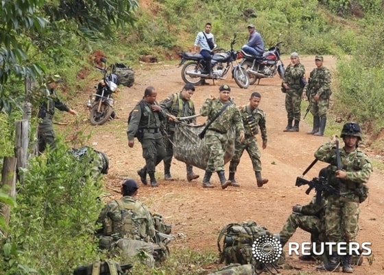 (라에스페란사 로이터=뉴스1) 이기창 기자 = 콜롬비아군 병사들이 15일(현지시간) 라 에스페란자 마을에서 반군의 공격으로 전사한 전우의 시신을 옮기고 있다. 후안 마누엘 산토스 대통령은 이날 반군의 공격으로 정부군 병사 10명이 전사했으며 이는 반세기에 걸친 내란 종식을 위한 노력을 물거품으로 돌리고 양측의 전투를 더욱 강화하는 처사라고 비난하고 공산주의 반군 콜롬비아무장혁명군(FARC)에 대한 폭격 재개를 명령했다.