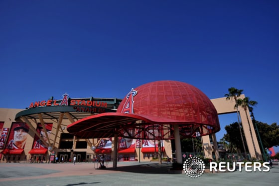 애너하임 로이터=뉴스1) 이기창 기자 = 애너하임에 위치한 미메이저리그 로스앤젤레스 에인절스의 홈구장 에인절 스타디움에 구단 야구모를 형상화해 세워진 정문 모습. 사진은 에인절스와 샌디에이고 파드리스의 경기 전에 촬영한 것이다.