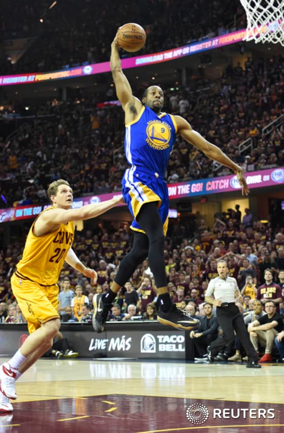 (클리블랜드 로이터=뉴스1) 이기창 기자 = 미프로농구(NBA) 골든스테이트 워리어스의 가드 안드레 이궈달라가 11일(현지시간) 클리블랜드의 퀵큰 론스 아레나에서 클리블랜드 캐벌리어스를 상대로 열린 챔피언결정전 4차전 1쿼터서 강력한 플라잉 덩크를 시도하고 있다.