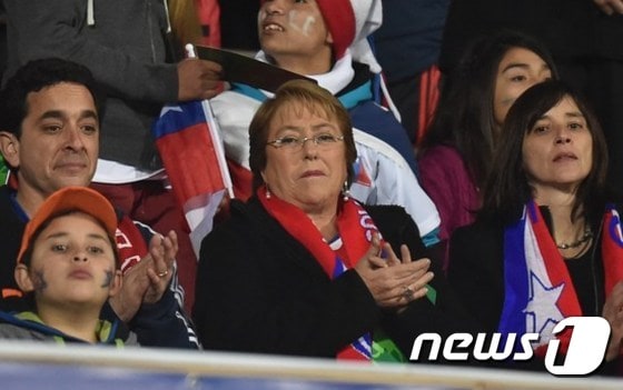 (산티아고 AFP=뉴스1) 이기창 기자 = 칠레의 미첼 바첼레트 대통령이 24일(현지시간) 산티아고에서 진행된 2015 코파 아메리카축구대회 칠레 대 우루과이의 8강전 경기를 지켜보고 있다.