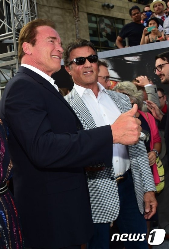 (할리우드 AFP=뉴스1) 이기창 기자 = 할리우드를 대표하는 액션스타 아놀드 슈워제네거(왼쪽)와 실베스터 스탤론이 28일(현지시간) 할리우드에서 진행된 '터미네이터 제니시스(Terminator Genisys)' 시사회에 참석, 팬들을 위해 포즈를 취하고 있다. 이 영화는 7월1일 미전역에서 동시 개봉된다.