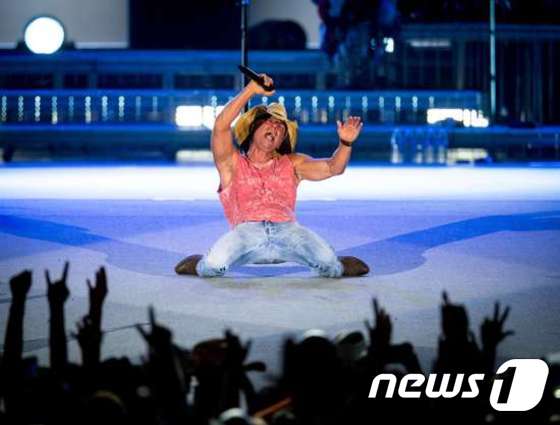 (파사데나 AFP=뉴스1) 최종일 기자 = 컨트리 뮤직 스타 케니 체스니가 25일(현지시간) 미국 캘리포니아주(州) 파사데나에 있는 로즈볼에서 열린 투어 공연에서 열창하고 있다.