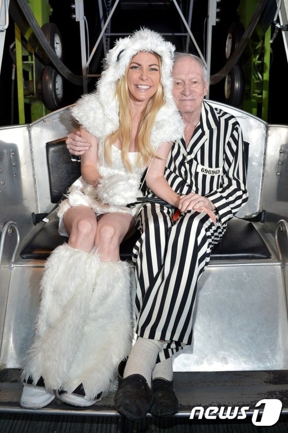(LA AFP=뉴스1) 최종일 기자 = 유명 성인잡지 플레이보이의 창업주 휴 헤프너(우측)와 60살 연하 아내 크리스털 헤프너가 24일(현지시간) 미국 캘리포이나주(州) LA에 있는 플레이보이 맨션에서 연례 할로윈 파티에 참석했다.