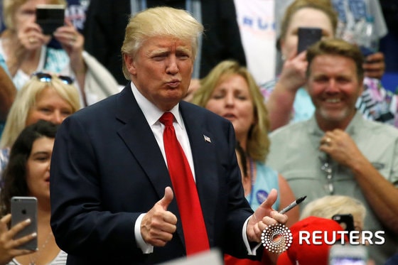 (아크론 로이터=뉴스1) 최종일 기자 = 도널드 트럼프 미국 공화당 대통령 후보가 22일(현지시간) 오하이오 주 아크론에서 열린 대선 유세에 참석했다.
