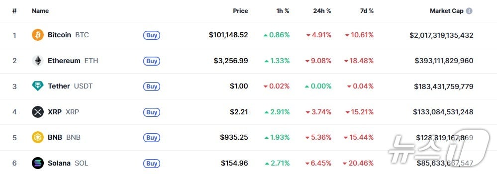 5일 8시 30분 현재 글로벌 코인 시황 중계사이트인 코인마켓캡에서 비트코인은 24시간 전보다 4.91% 하락한 10만1148달러를 기록하고 있다.