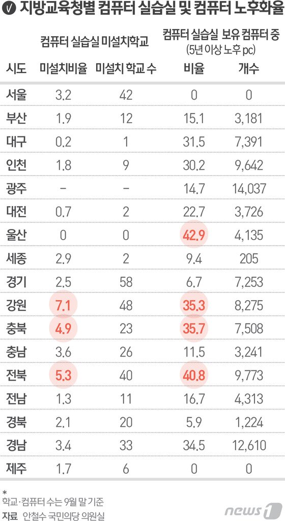 특히 울산지역의 경우 학교 컴퓨터실습실 안에 노후 컴퓨터가 설치된 비율이 42.9%로 가장 높았다. 전북은 40.8%로 그 뒤를 이었다. 충북은 35.7%, 강원은 35.3% 등이었다.