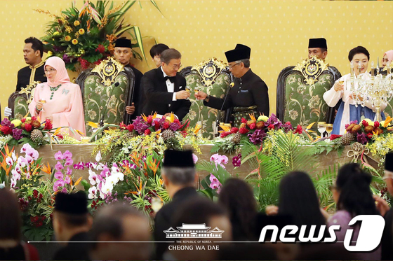 | 말레이시아를 국빈 방문 중인 문재인 대통령이 13일 오후(현지시간) 국립왕궁에서 열린 국빈만찬에서 압둘라 국왕과 건배를 하고 있다. (청와대 페이스북) 2019.3.14/뉴스1 |