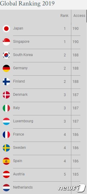 한국은 독일 및 핀란드와 함께 188개 국가를 무비자로 여행할 수 있는 것으로 나타나 공동 2위에 올랐다.