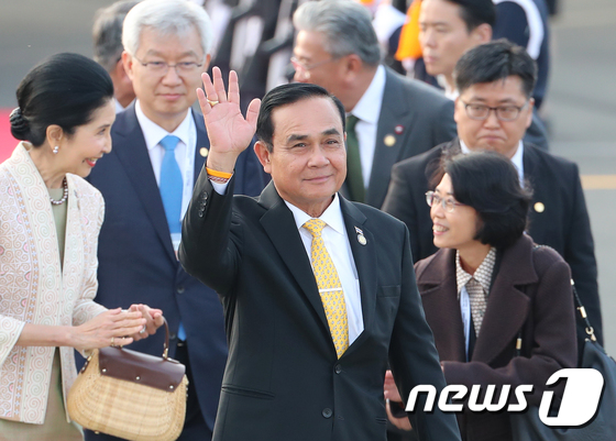 | 한·아세안 특별정상회의 참석차 방한한 쁘라윳 짠-오차 태국 총리가 24일 오후 김해공항에 도착해 손을 흔들고 있다. (2019 한-아세안 특별정상회의 제공) 2019.11.24/뉴스1 © News1 성동훈 기자 |