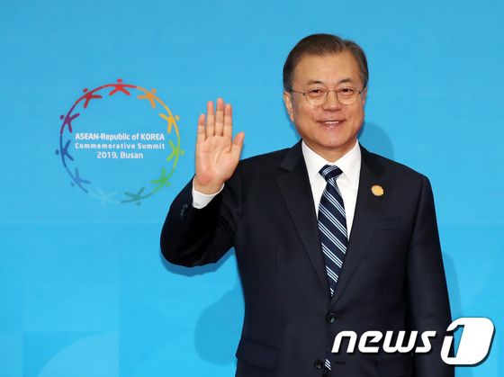 | 문재인 대통령이 지난 11월 26일 오전 부산 벡스코 컨벤션홀에서 2019 한-아세안 특별정상회의에 참석하는 각국 정상을 기다리던 중 취재진을 향해 손을 들어 인사하고 있다. (2019 한-아세안 특별정상회의 제공) 2019.11.26/뉴스1 |
