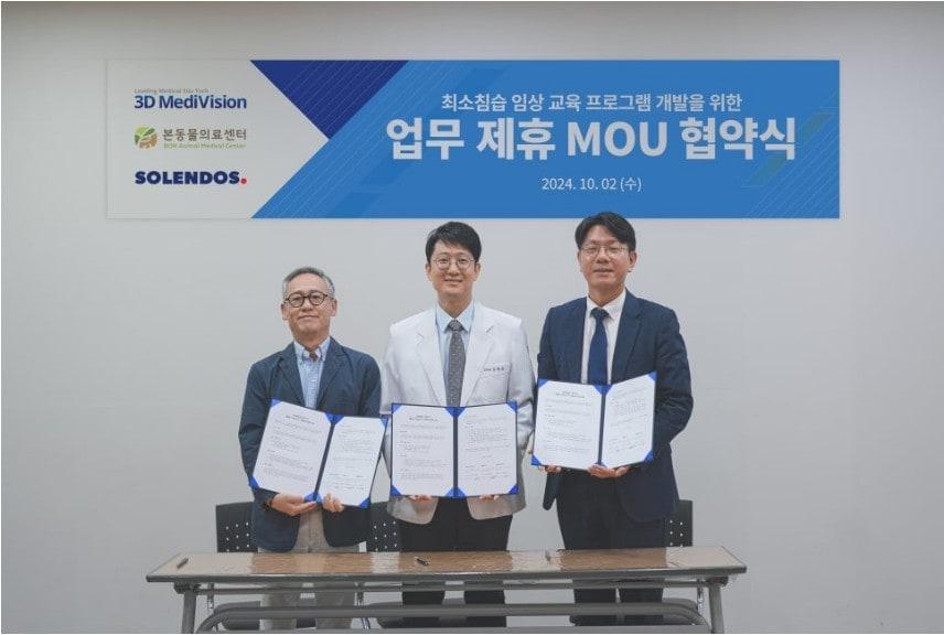 실습 세미나 및 수의학 임상 교육 위한 협약 체결왼쪽부터 김기진 쓰리디메디비젼 대표, 김용선 본동물의료센터 원장, 이선호 솔렌도스 대표가 협약식에서 기념 사진을 찍고 있다.(본동물의료센터 제공). ⓒ 뉴스1관련 키워드펫헬스케어동물병원수의사반려동물한송아 기자 당진 ASF, 사람·물류 통해 유입 가능성…정부 '전방위 방역 강화'수의학 교육 질 높인다…대한수의사회-한국교총, 업무협약 체결관련 기사수의학 교육 질 높인다…대한수의사회-한국교총, 업무협약 체결"지방도 복강경 문의 늘어"…코벳 수의사 술기 세미나 호응수술 실습·글로벌 기준까지…수의골관절학회 교육 행보 '주목'"보호견 자궁축농증 수술 지원"…동물사랑봉사, 연말 온기 전해반도체 클린룸 기술, 반려동물 수술실로 들어오다