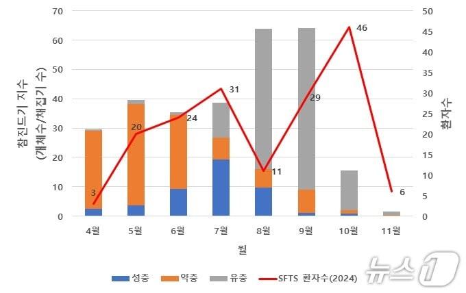 질병청, 참진드기 봄철 활동 시작 맞춰 전국서 감시사업 착수2013년부터 지난해까지 2065명 환자 발생…'치명률 18.5%'참진드기 지수와 환자 수(질병청 제공) 2025.4.14/뉴스1ⓒ News1발생단계별 참진드기 모습(질병청 제공) 2025.4.14/뉴스1ⓒ News1관련 키워드질병청참진드기조유리 기자 자외선 차단 원료 '페닐렌 비스-디페닐트리아진' 신규 지정'알파-만노사이드축적증' 치료 희귀의약품 국내 첫 허가관련 기사검역본부-질병청, 부처 칸막이 없는 '원팀'으로 인수공통감염병 차단에스티팜, 중증열성혈소판감소증후군 'mRNA' 백신 공동개발 착수중증열성혈소판감소증 mRNA 백신 개발 착수…국제 공동연구 일환올해 모기·참진드기 발생 줄어…"근거중심 방제사업 덕분"올해 진드기 매개 SFTS 환자 '100명 육박'…의료진 2차 감염 주의