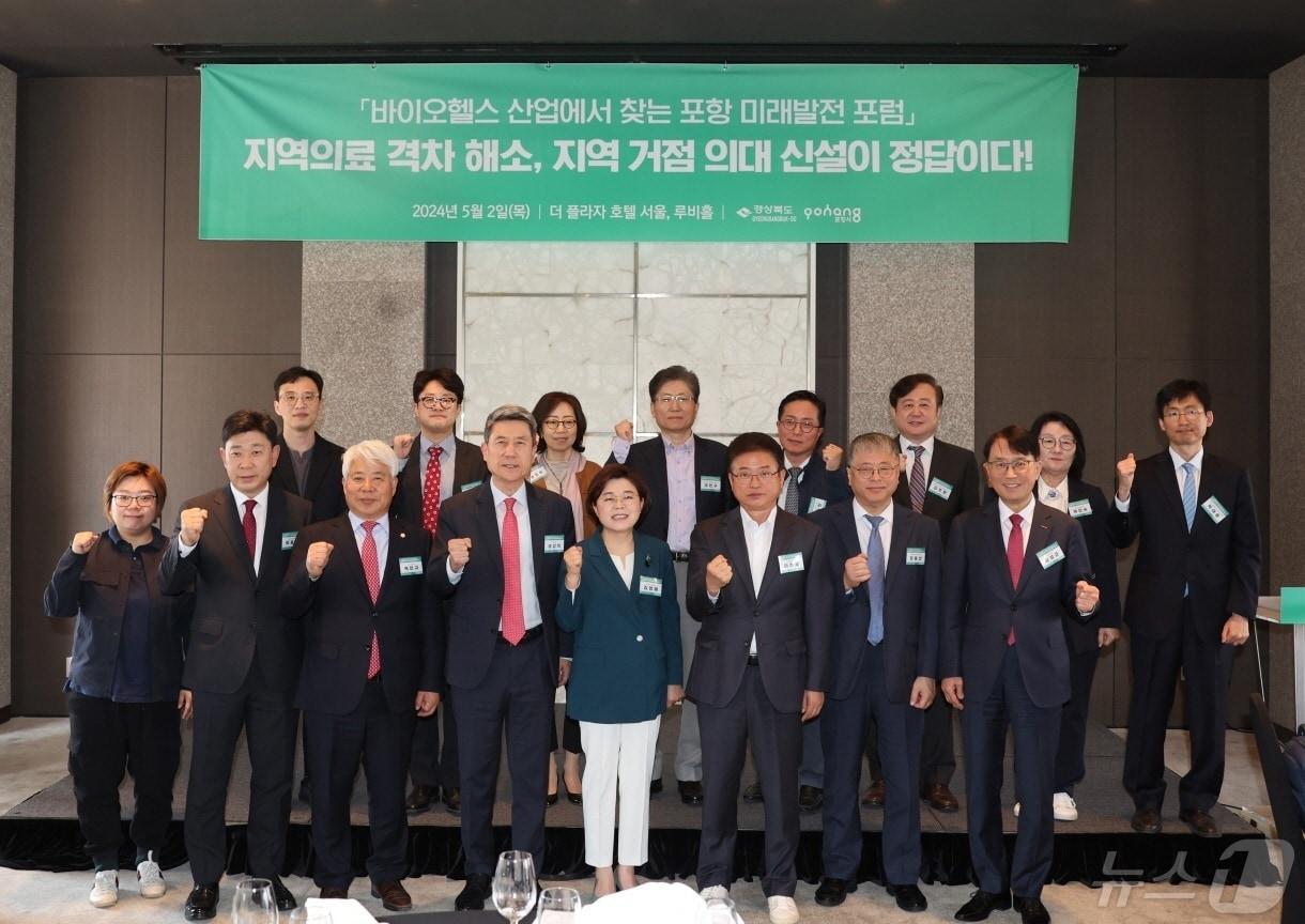 2일 서울서 '바이오헬스 산업에서 찾는 포항 미래발전 포럼' 개최이강덕 포항시장 "지방에 사람이 살려면 의대 설립 절대적 필요"경북도와 포항시가 2일 서울 플라자호텔에서 '바이오헬스 산업에서 찾는 포항 미래발전 포럼'을 개최한 후 참석자들과 함께 기념촬영을 하고 있다. 2024.5.2/뉴스1