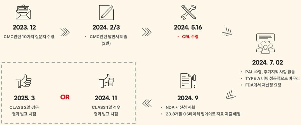 9월 재신청 계획…사소한 결함 '클래스1' 분류 시 2개월 후 결과광범위한 우려 '클래스2' 분류되면 2025년 3월로 발표 미뤄져간암 1차 치료제 '리보세라닙'+'캄렐리주맙' 허가와 관련해 미국 식품의약국(FDA)이 보완요구서한을 발행한 후 진행 상황.(에이치엘비 제공)/뉴스1 ⓒ News1관련 키워드에이치엘비HLB리보세라닙간암 신약캄렐리주맙엘레바신약허가신청FDA황진중 기자 대웅 보툴리눔 美 파트너, 6년 연속 성장…"올해부터 흑자 지속"차바이오텍, 한화손보·생명서 1000억 규모 투자 유치…MOU 체결관련 기사운명의 시간 다가온다…HLB, '리보세라닙' FDA 심사 '초읽기'이번엔 다를까?…HLB, '리보세라닙' FDA 세 번째 도전진양곤 HLB 회장 "간암 신약 보완사항 파악해 허가 재신청"진양곤 HLB 회장 "리보세라닙, 이르면 7월 결론 날 것"…FDA 삼수HLB 간암 신약 '리보세라닙' 병용 FDA 승인 또 불발…"CRL 수령"