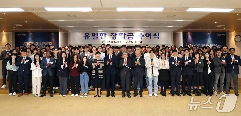 외국인 유학생·다문화 가정 석·박사 과정 학생 등 지원유한재단 관계자와 장학생들이 '2025년 유일한 장학금 수여식' 후 기념 사진을 찍고 있다.(유한양행 제공)/뉴스1관련 키워드유한재단유한양행유일한유일한 장학금유한학원황진중 기자 로엔서지컬, AI 신장결석 수술로봇 '자메닉스' 인도네시아에 수출뉴로핏, 한국에자이와 '뉴로핏 아쿠아' 치매 진단 서비스 MOU 체결관련 기사유한재단, 제28회 '유재라봉사상' 여약사부문 시상식 개최유한재단, 북한 출신 대학생 100명에 장학금 수여…총 5억 규모유한양행 창업자 유일한 박사 영면 54주기…"창업주 정신 되새겨"유한양행, 22년 연속 '가장 존경받는 기업' 제약부문 1위유한재단, 141명에 2025년 장학금 수여…올해 총 77억원 쓴다