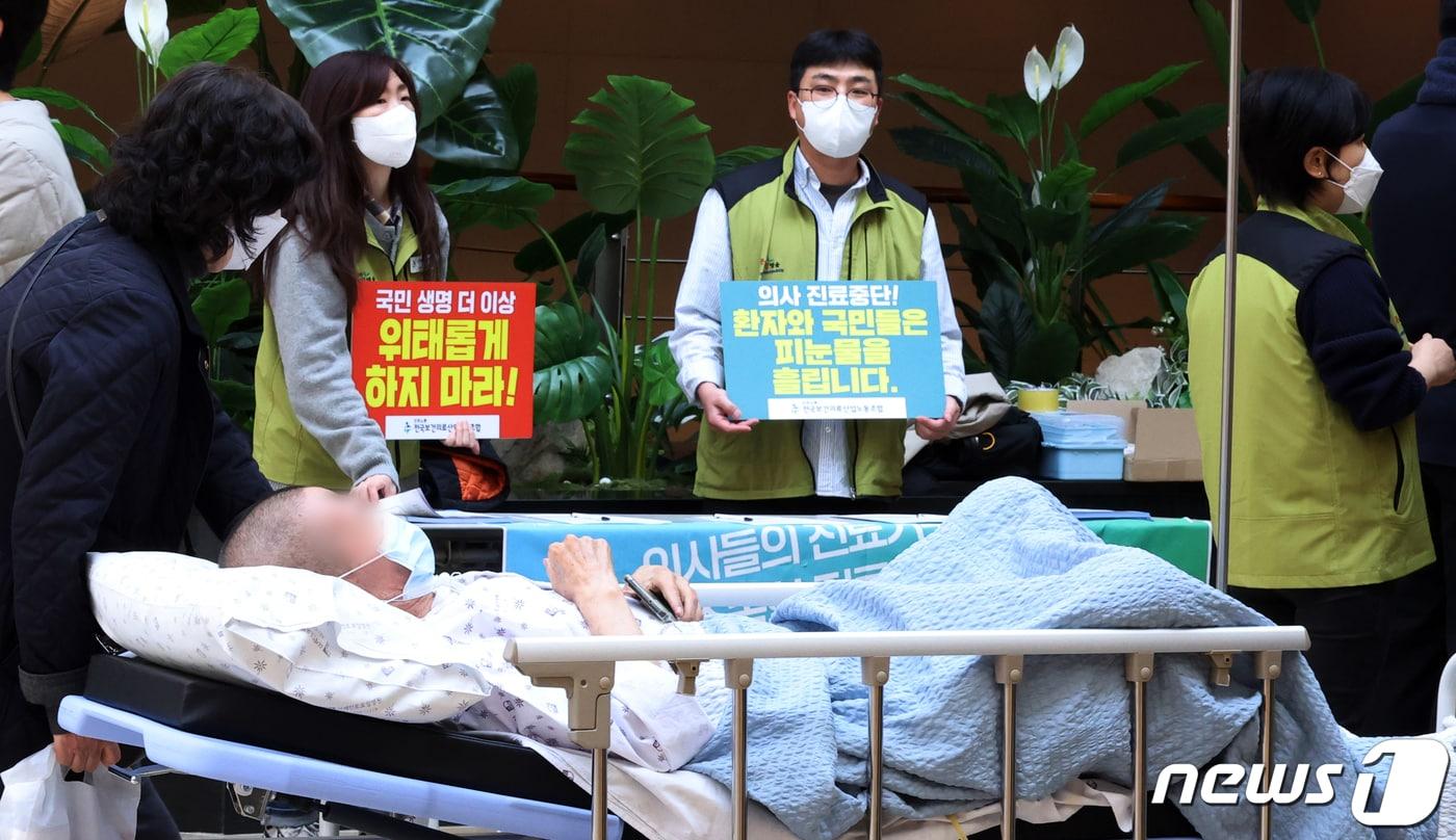 3월15일 오전 서울 구로구 고려대학교 구로병원에서 열린 전국보건의료산업노동조합의 '의사들의 진료거부 중단! 조속한 진료 정상화! 필수의료·지역의료·공공의료 살리기' 범국민 서명운동에서 환자와 보호자가 서명에 동참하고 있다. 2024.3.15/뉴스1 ⓒ News1 김명섭 기자